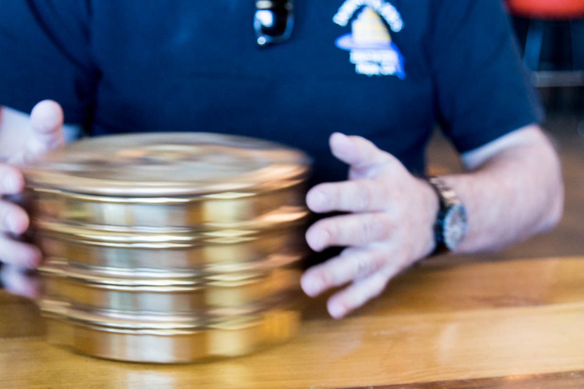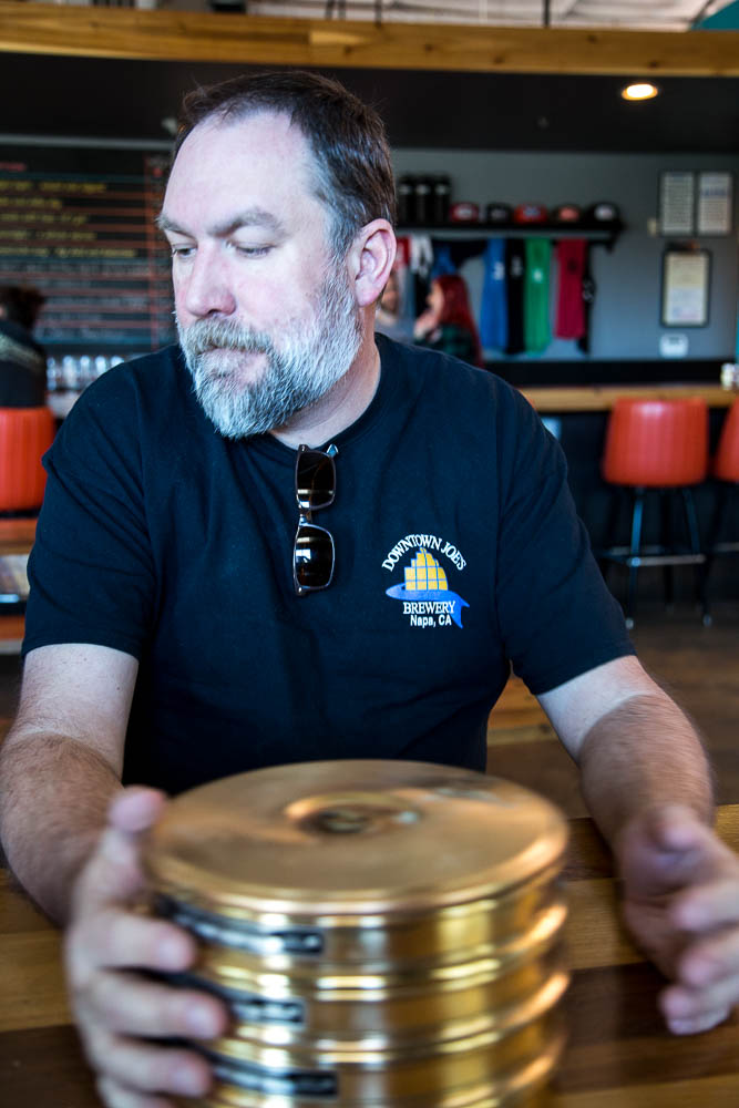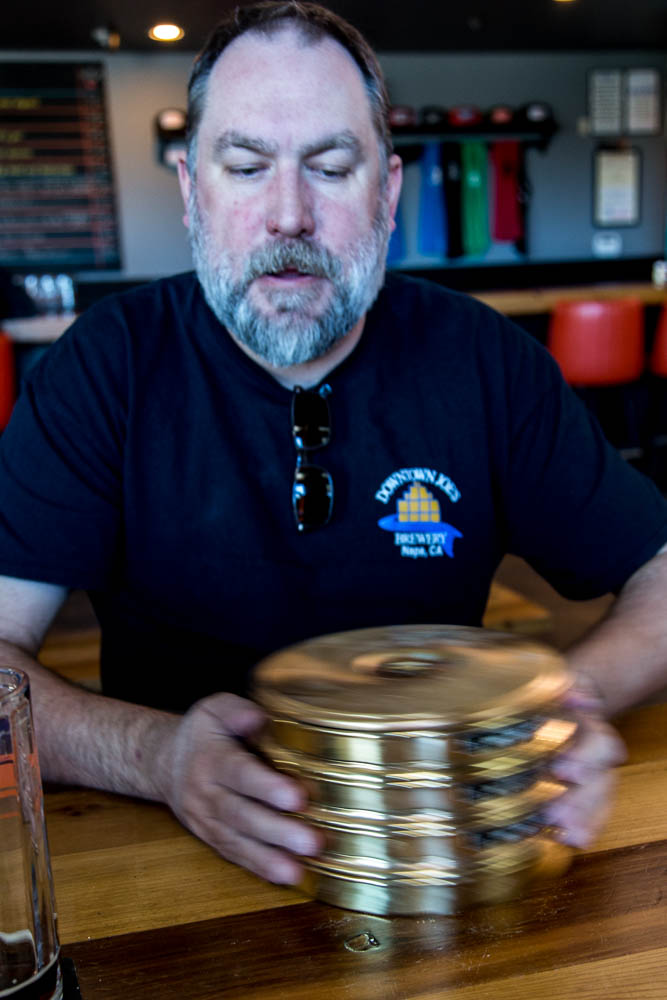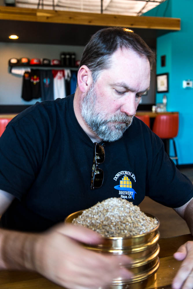 They brought out the sieves and a scale and talked me through the procedure. Stack the filters from coarse to fine onto the catch pan. Add in a small, but representative, homogenous sample and shake. Shake a long time, randomly, for at least 20 minutes. Apparently many breweries that bother to have sieves as part of their lab use a shaker or orbital table. This eliminates differences based on shaking by hand... and I decided to just shake for 10 minutes. Each batch of malt was shaken and slid between hands for 10 minutes each, measuring the total residual weights in each filter and finally the flour pan. Doing this at a brewery after the lunch crowd drew a few funny looks. My Downtown Joes t-shirt is a nod to another nerdy brewer - Colin Kaminsky. He would be proud of the white streaks of malt flour that coated the front.